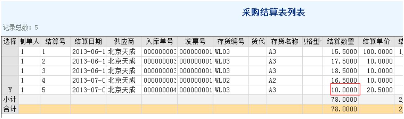 4、采购入库单与发票手工结算,但只结算了部分 10 个