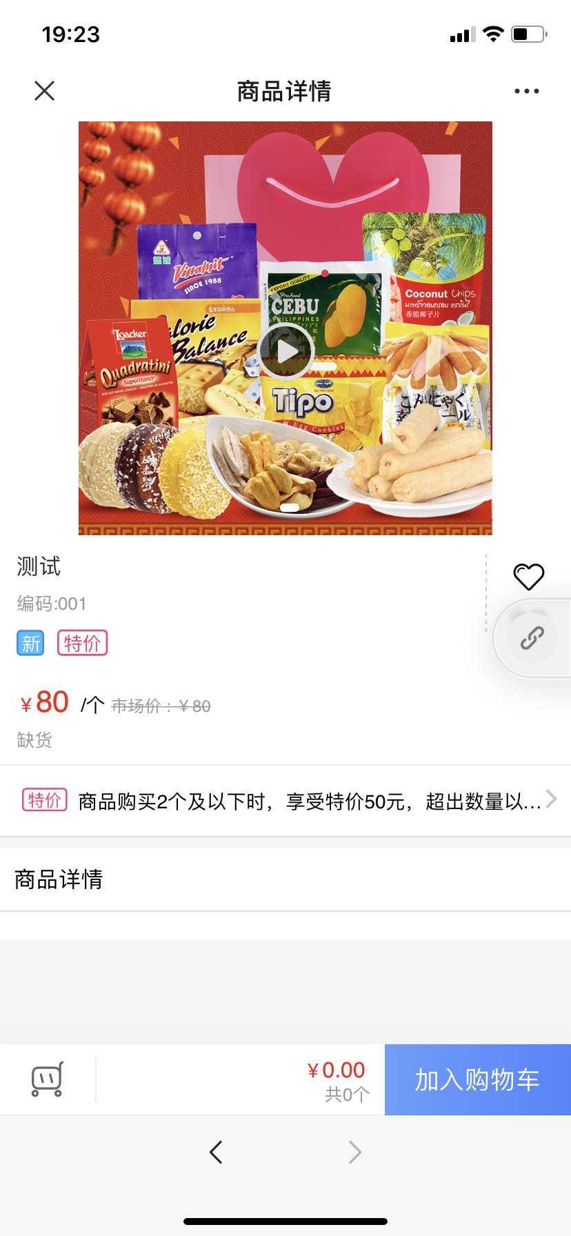 二、使用手机端登录订货商城可以发现该存货上显示了特价50元,原价80元,点击进去后查看详情显示了促销名称、促销时间。