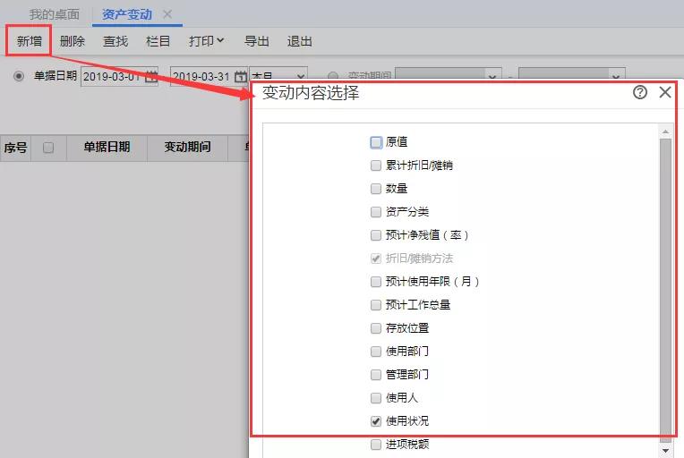STEP1:当资产需要停用时,点击【资产管理】-【资产变动】,点击【新增】按钮,选择使用状况。