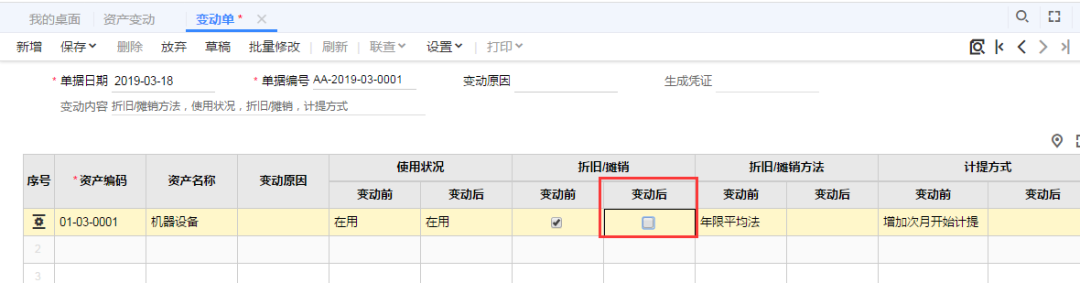 STEP2:在变动单的界面,选择好需要停止折旧的卡片后,将这个固定资产的【折旧/摊销】变动后的勾取消掉。