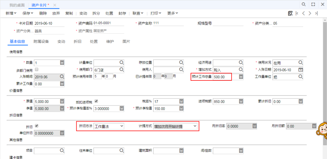 可以在工作量统计里录入对应资产的本月工作量后,再进行计提折旧。