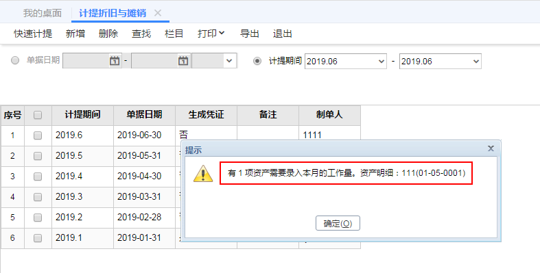 软件做计提折旧时,提示有一项资产需要录入本月的工作量,点击【确定】也不会出现计提的记录,要怎么办呢?