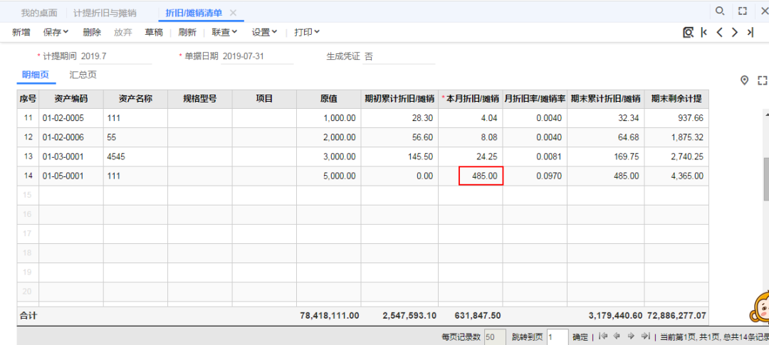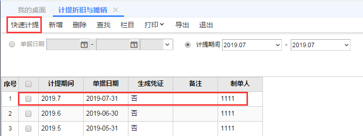 STEP2:进入【资产管理】-【固定资产】-【业务处理】-【计提折旧与摊销】,点击【快速计提】则会如下图所示出现一行7月折旧记录,双击打开可以看到对应【折旧摊销清单】,在折旧摊销清单里可以很清楚的看到对应资产的月折旧额为485元。