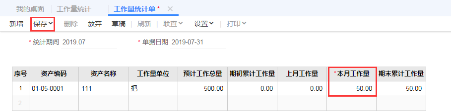 STEP1:依次点击【资产管理】-【固定资产】-【业务处理】-【工作量统计】-【新增】针对该固定资产填写当月的工作量,如上述例子,填写本月工作量50公里,并【保存】;