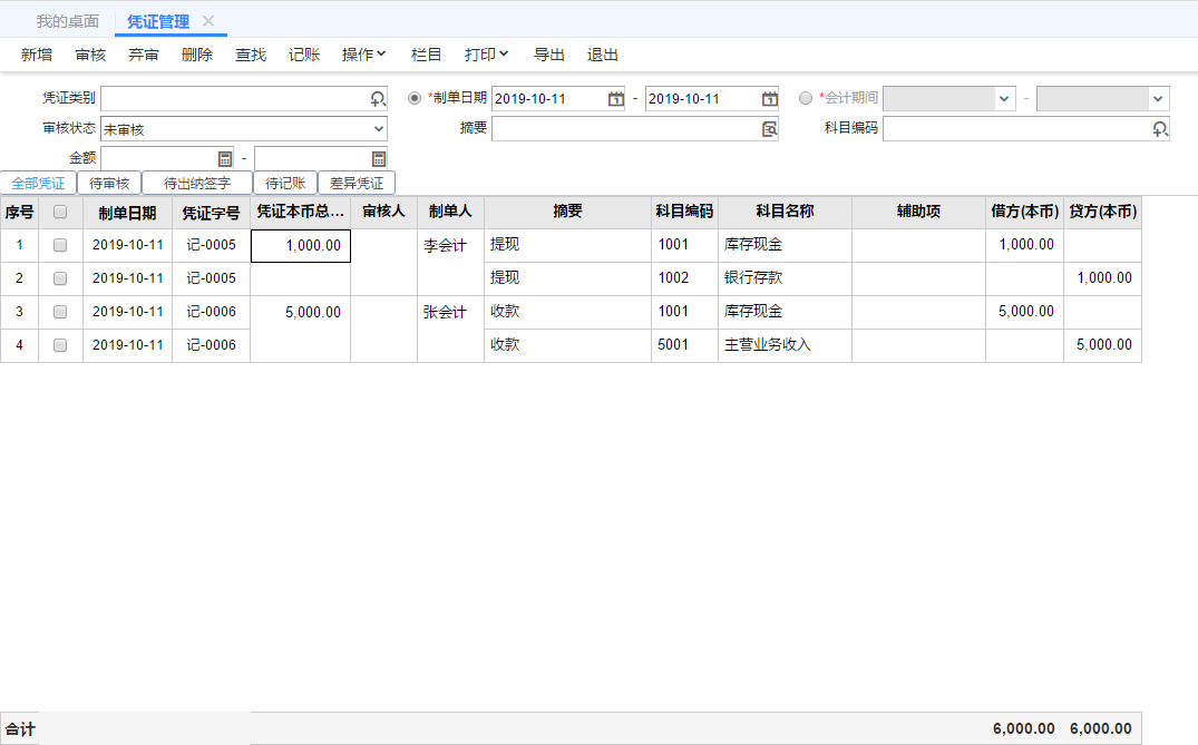 在审核、记账凭证的时候,通常是点击查询凭证管理,然后在凭证管理里进行批量审核
