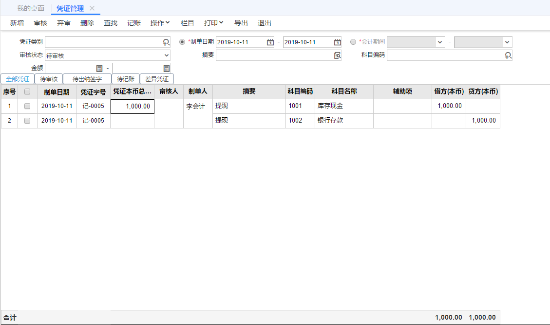 但是按待审核状态查凭证却只能显示一张凭证,如下图所示