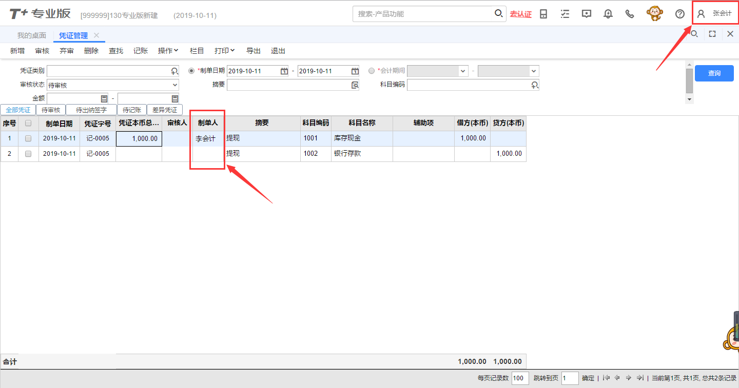 在审核状态下,财务经理按未审核当前的凭证有两张,如下图