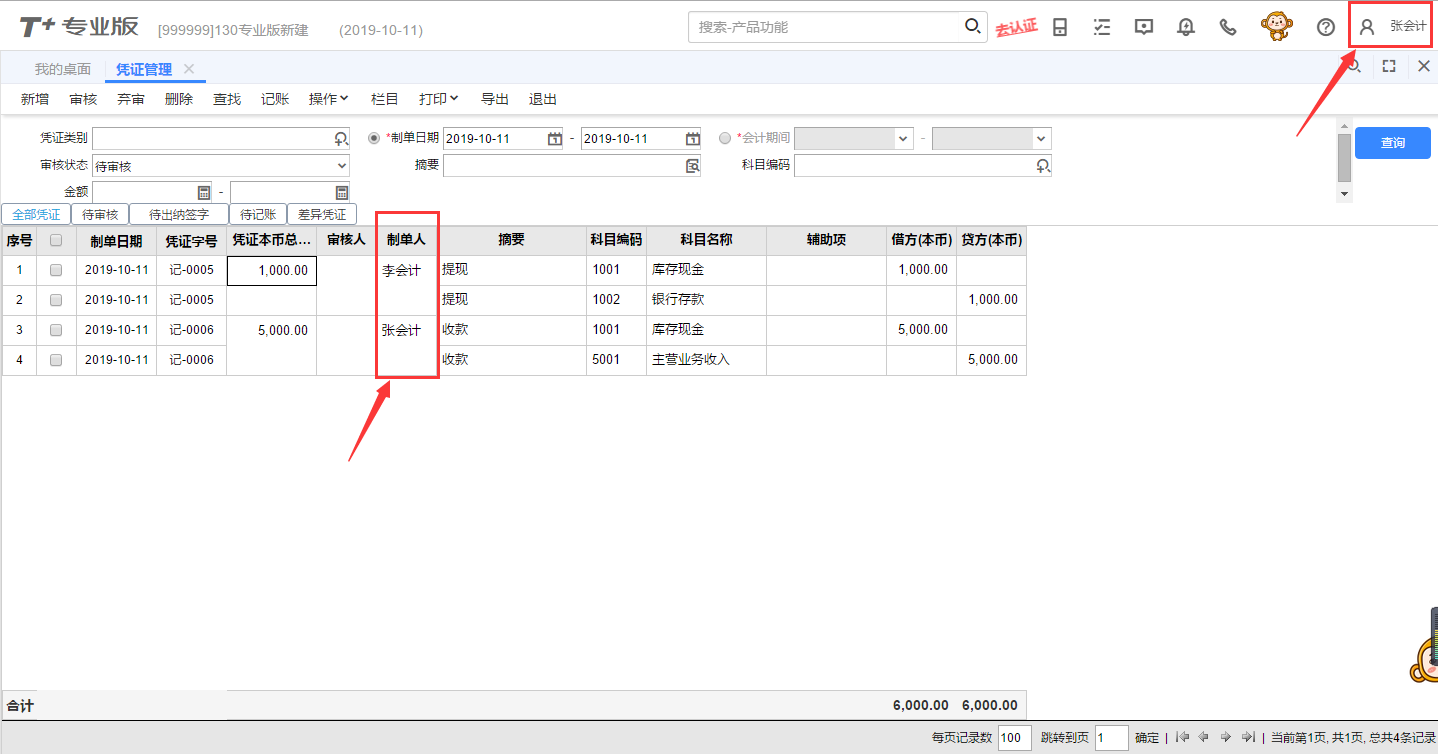 查询出的凭证数据则可以显示制单人为当前操作员的凭证,如下图所示