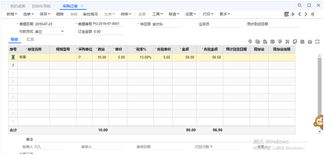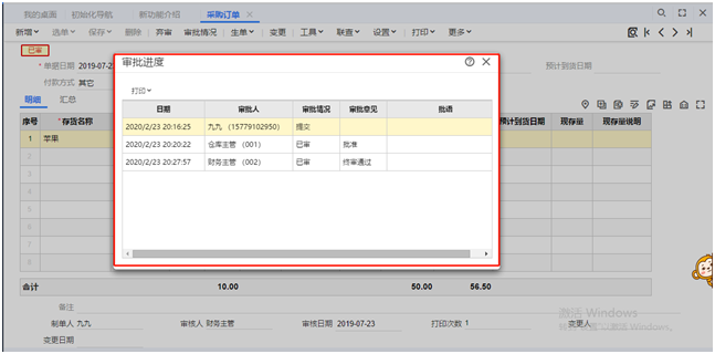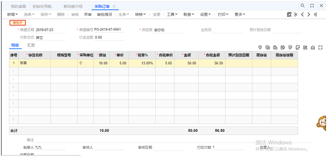3.会计登录软件填制一张采购订单,此时可以用仓库人员和财务人员其中一个人员登录后审核后提示审核中,两人均审核后才可进行采购入库。