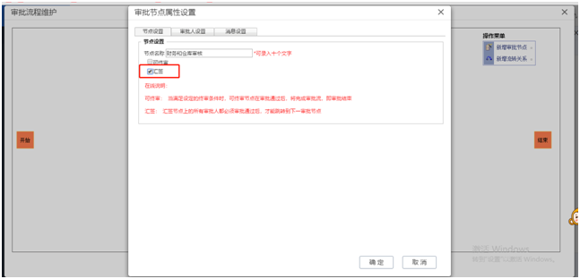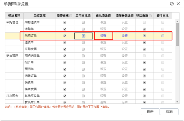2.系统管理-单据审核设置,将采购订单的启用审批流勾选起来,并点击审批流设置设置好审批流程,新增节点“财务和仓库审核”并勾选好【汇签】,审核人设置里勾选“财务人员”和“仓库人员”。
