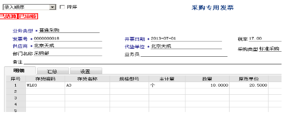 2、发票和入库单同时到,根据采购入库单生成采购专用发票,数量为 10 个