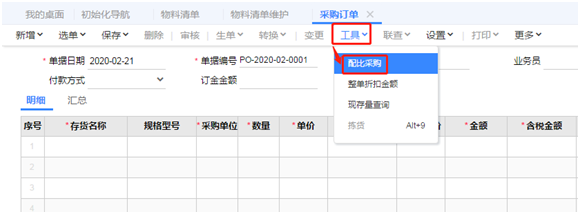 2、点击【采购管理】-【采购订单】,在采购订单的界面,点击“工具”下的“配比采购”。弹出的“配比采购”界面,录入好“存货名称”和“数量”,点击【确定】按钮,就能自动生成一张所有原材料的采购订单。