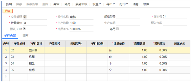 1、依次点击【基础设置】-【物料清单】,根据产品结构,设置好物料清单。