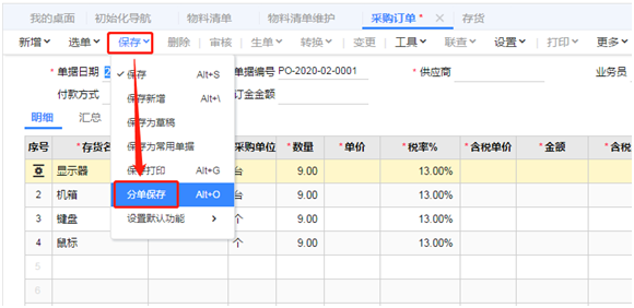 2、点击【采购管理】-【采购订单】,在采购订单的界面,点击“保存”下的“分单保存”。系统就会根据存货档案中的“默认供应商”自动分成多张采购订单。