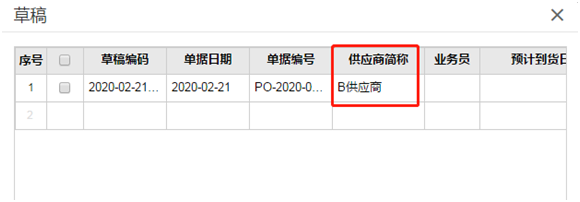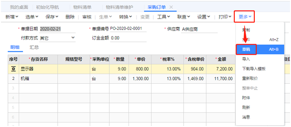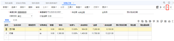 其他供应商的采购订单,点击右上角的“下张”按钮查看,或者在“更多”菜单下的“草稿”中查看: