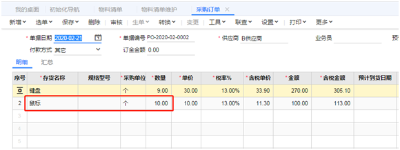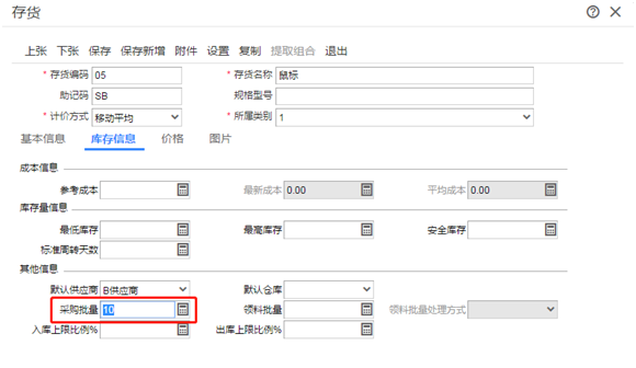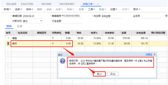 2、在保存采购订单时,当鼠标的数量不是10的整数倍,系统会弹出提示“存货主计量数量不是采购批量的整数倍,是否保存?点【是】向上取整后保存,点【否】直接保存!”,提示界面点击【是】,存货鼠标的数量自动从9个变成10个。