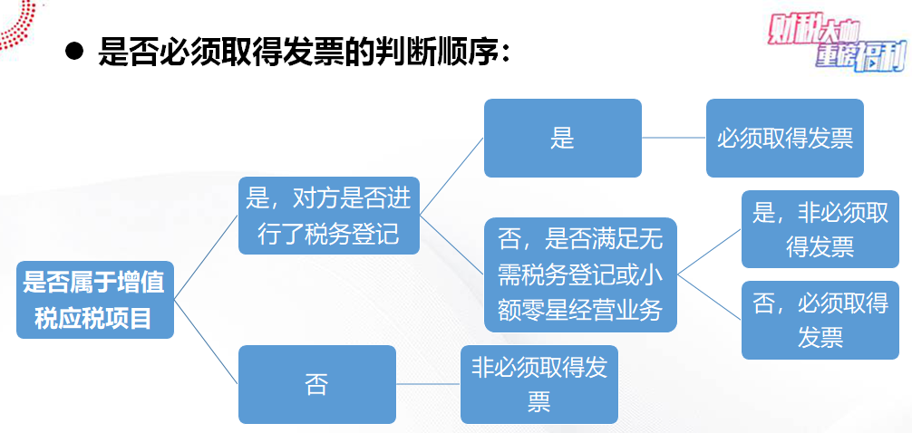 2、下一步的判断就是看提供货物、服务、劳务的纳税人是否进行了税务登记。如果进行了税务登记,则必须得有发票才可以税前扣除;如果无需税务登记或者属于从事小额零星经营业务的个人,则可以使用税务机关代开的发票或者收款凭证及内部凭证进行税前扣除,而非必须有发票。
