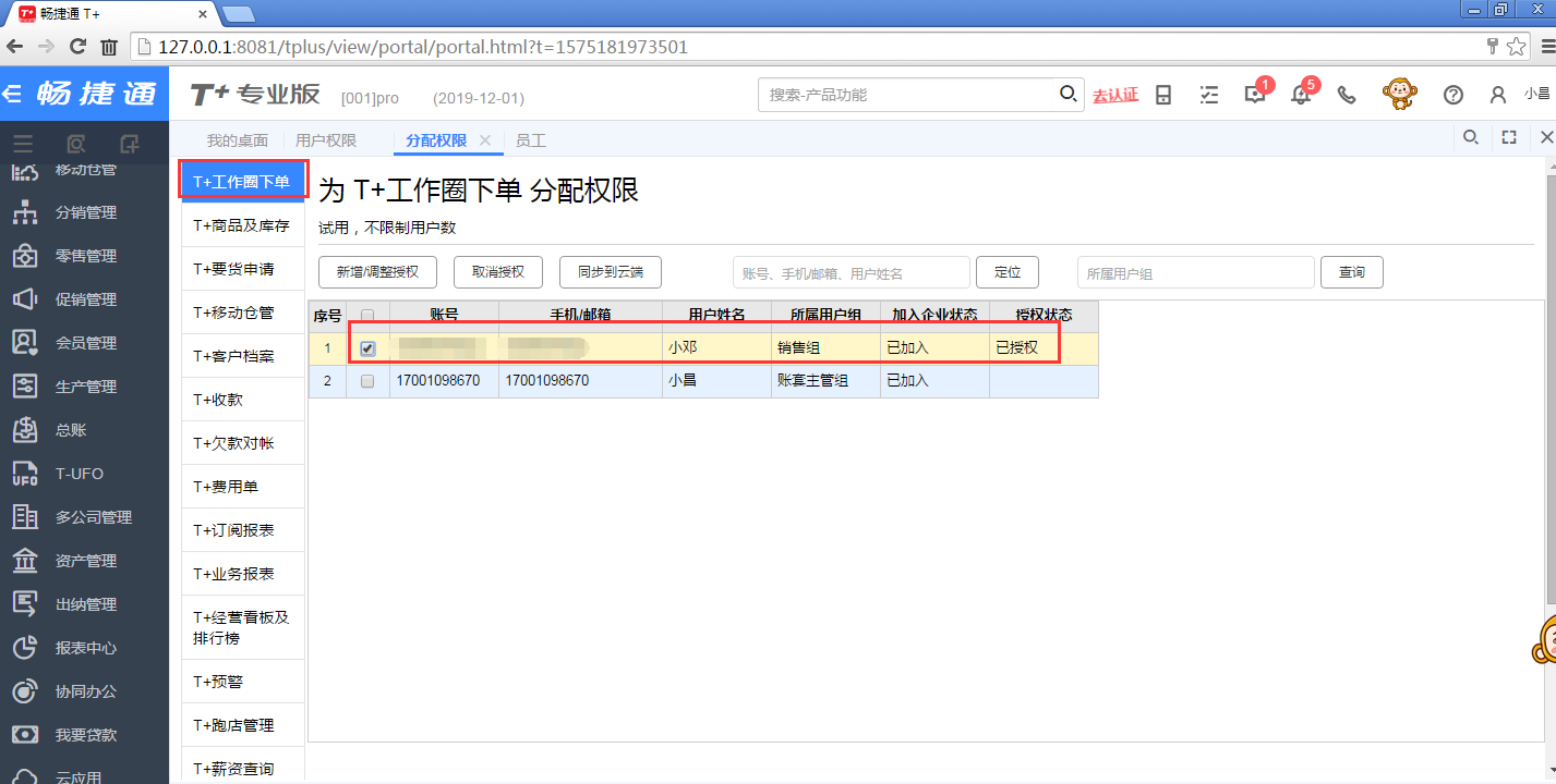 (1)系统管理-用户权限-移动应用授权,给予业务员授予“工作圈下单”、 “T+对账交款”、“T+收款”的权限;