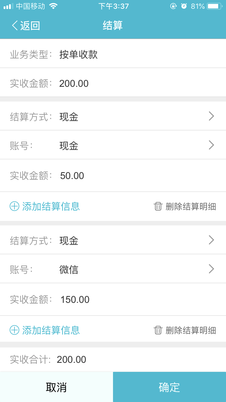 当客户给我们钱时,在T+收款中,填制一张“按单收款”单;现金收了50元,微信收了150元;