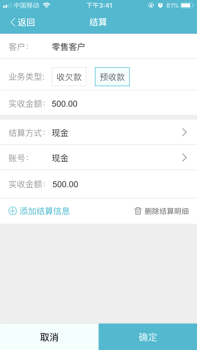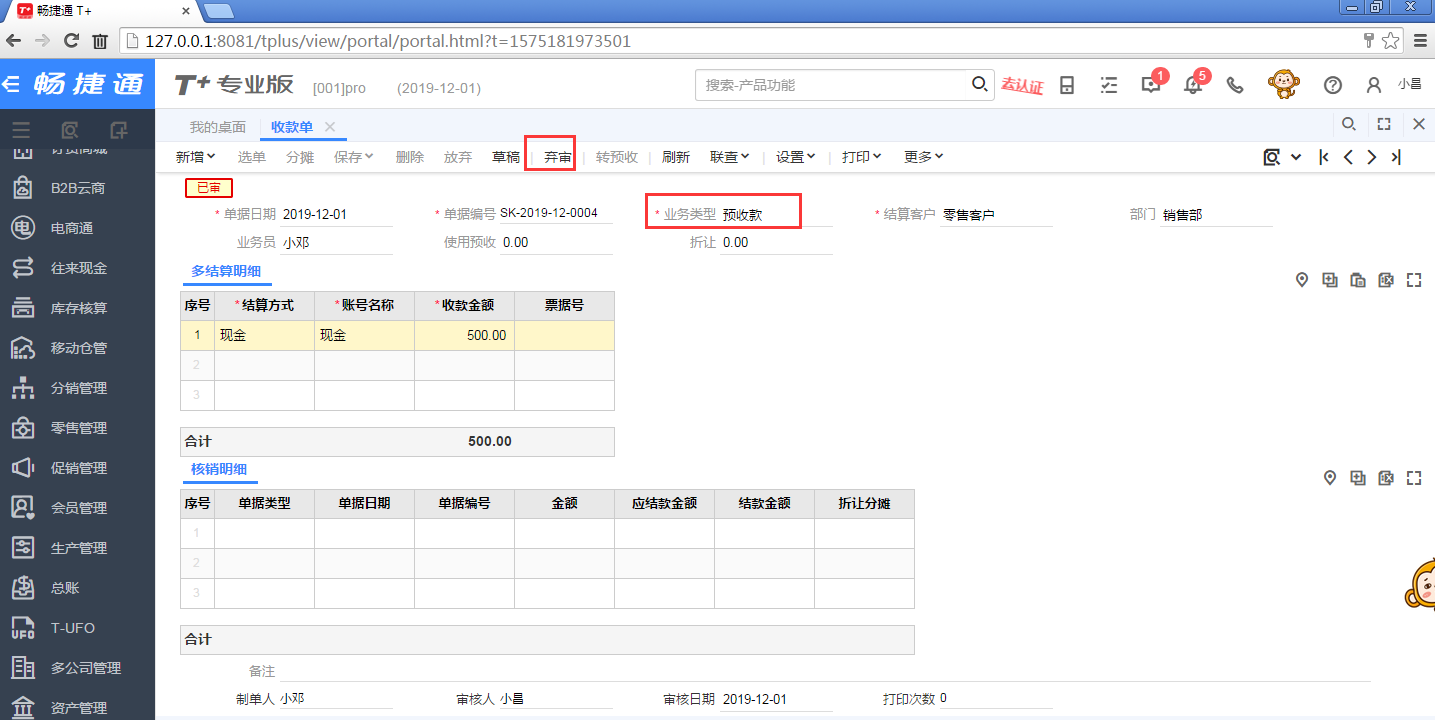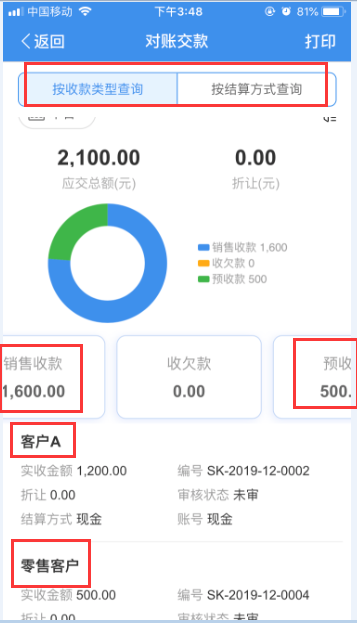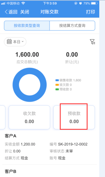 (6)此时,业务员,再次查看工作圈中,T+对账收款的数据,选择“未审”的数据,则会少这一笔500元的预收。备注:“未审”在T+对账收款中,表示业务员还没把钱交钱财务的数据。