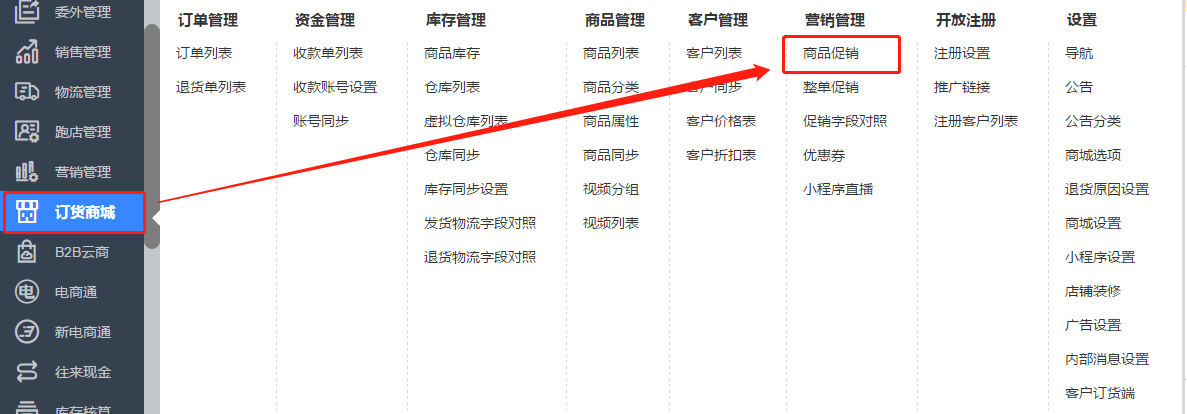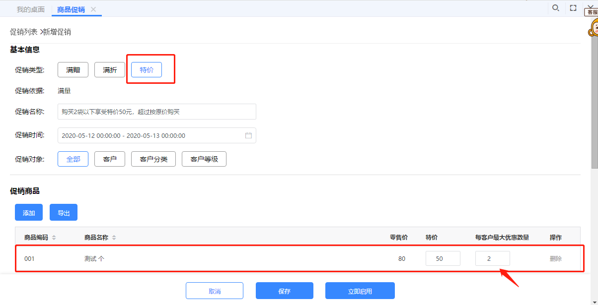 一、点击【订货商城】-【商品促销,进入到商品促销的界面,并选择【特价】后填入促销名称、促销时间、选择促销对象和促销商品后设置对应的特价及每客户最大优惠数量。