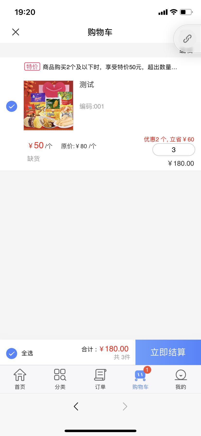 三、选择3件进行下单可以发现总价变为180,两件特价50元+一件原价80元得到180元,若提交完这个订单后,在主界面上还是显示特价50元,但是点击进入该存货后就会发现显示的是特价,但是价格为80元/个。