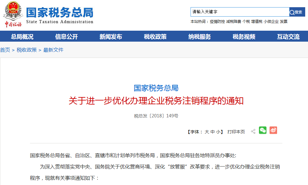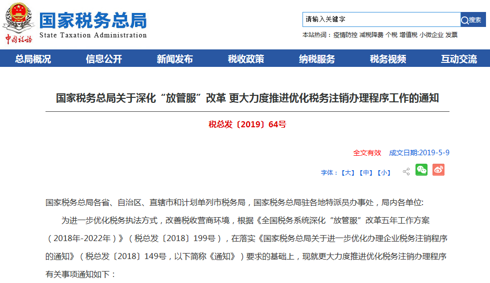 针对企业“注销难”问题,税务总局制发了税总发〔2018〕149号《国家税务总局关于进一步优化办理企业税务注销程序的通知》,税总发[2019]64号 《国家税务总局关于深化“放管服”改革更大力度推进优化税务注销办理程序工作的通知》两篇通知,推行清税证明免办、即办服务,创新推出“承诺制”容缺办理,简化资料和流程。