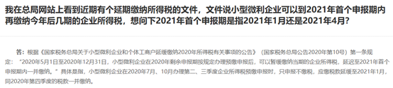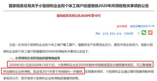 与小微企业息息相关的还有企业所得税,由于疫情的影响,国家税务总局发布了一系列税收优惠政策,其中2020年10号公告,规定2020.5-2020.12,小型微利企业的企业所得税可以缓交,延迟至2021年的首个申报期一并缴纳。