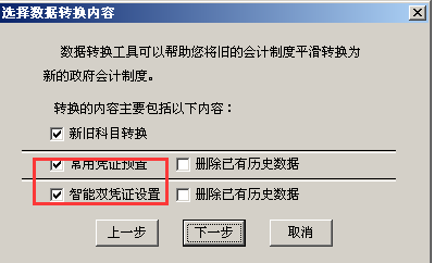 2、转换内容注意勾选智能双凭证设置和常用凭证设置(这是新政府制度的重点,默认是勾选的)