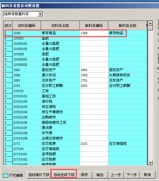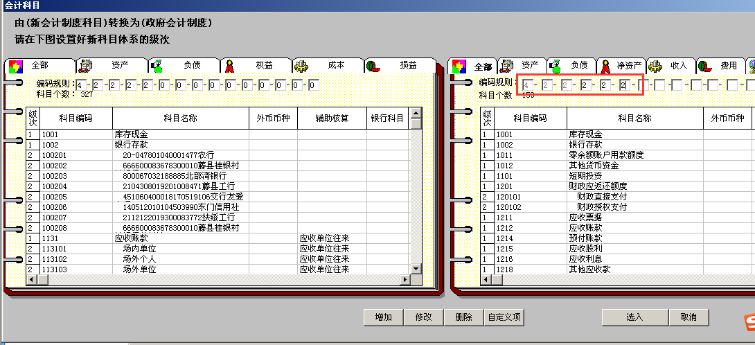 3、在进行科目匹配的时候要注意调整新制度的编码规则:
