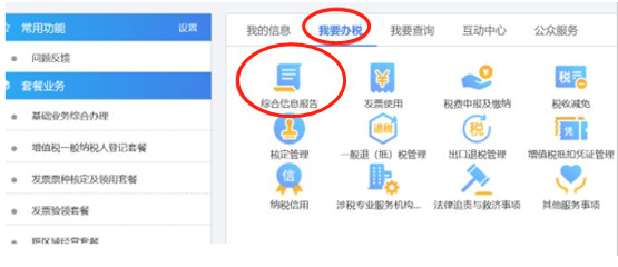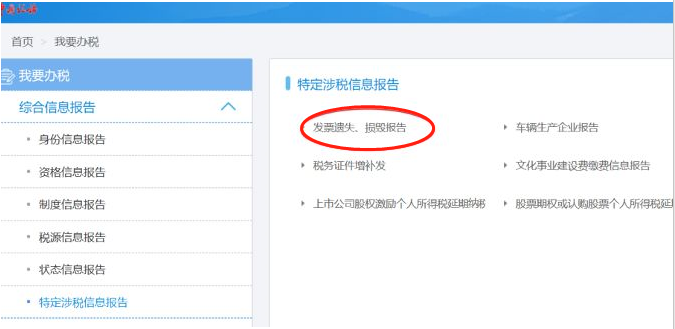 登录电子税务局网站,在“我要办税”模块选择“综合信息报告”,选择“特定涉税信息报告”-“发票遗失、毁损报告”进行申报。如下图所示: