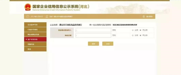 填写2019年度“营业额或营业收入”和“纳税总额”(单位是“万元”,纳税额以实际缴纳数额为准,未纳税的纳税总额填写0),并在后方选择是否公示(必须选择),点击“保存”。