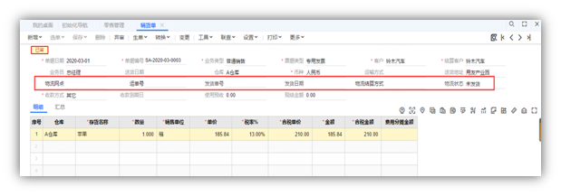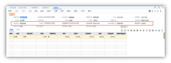 确定发货后,查询销货单可以看到【物流网点】,【运单号】等信息已经回填。