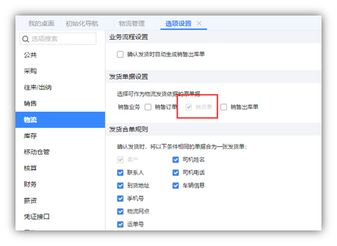 一.在【系统管理】-【选项设置】中选择【发货单据设置】,该设置在发货时作为发货的依据,确认发货时,把发货信息回填至销售订单,销货单,或者销售出库单,我们以销货单为例。