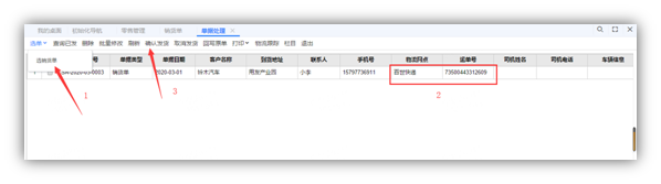 在【物流管理】-【单据处理】-【选单】选取同一客户一张或多张单据,带入单据处理界面,填入【物流网点】和【运单号】等信息,进行发货处理。
