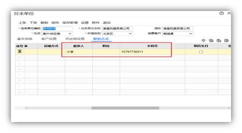 1.在【基础设置】-【往来单位】-【联系方式】界面设置【联系人】和【手机号】