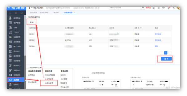 2.点击【云应用】-【小程序设置】添加往来单位,并发出邀请,客户手机上会收到短信