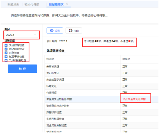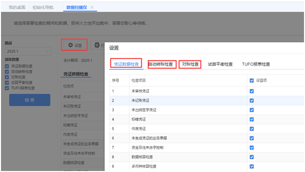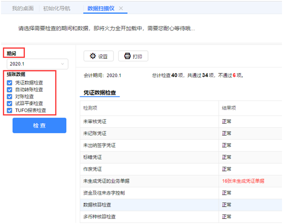 1.在总账→期末处理→数据扫描仪中设置在检查的项目,点击保存。