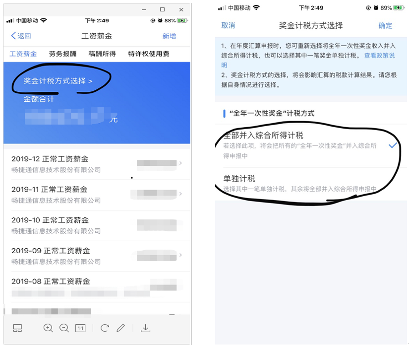 发放全年一次性奖金时选择单独计税的,年终汇算清缴时,还可选择将其并入综合所得计税,具体操作是在工资薪金栏次通过“奖金计税方式选择”全部并入综合所得计税。