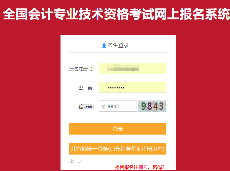 登录自己报名时的返回的报名注册号和密码;