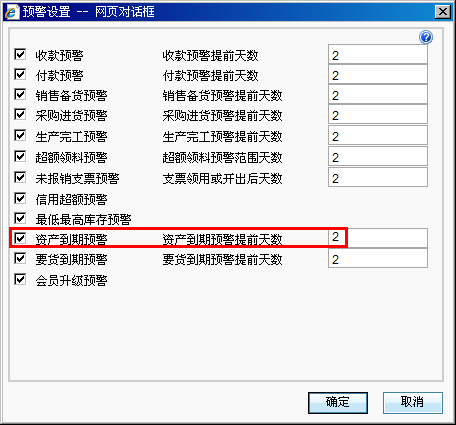 1、“系统管理”—“账套设置”—“预警设置”—“资产到期预警”