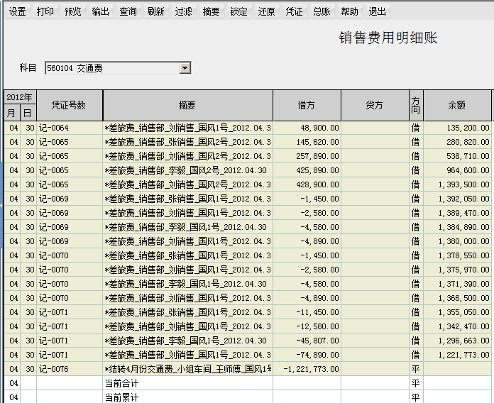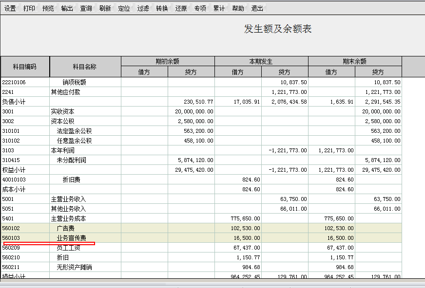 仔细看上面的明细账,本期借方是有发生,但是正负抵消了,相当于借方发生额合计是0,贷方发生额合计也是0,余额表中不显示借方、贷方发生额合计都为0的科目,这个是软件的限制。