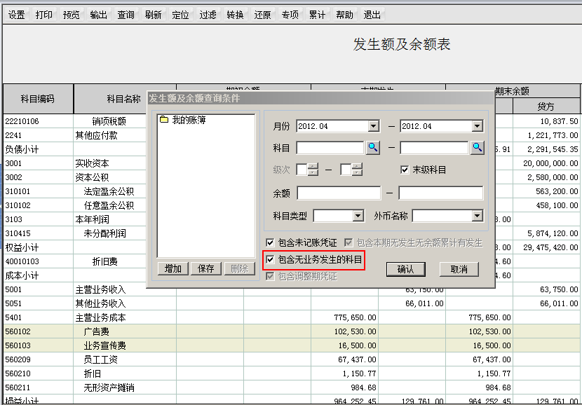 新版的过滤条件可以勾选“包含无业务发生的科目”,以前老版本过滤条件中没有这个勾选就不能显示出来。