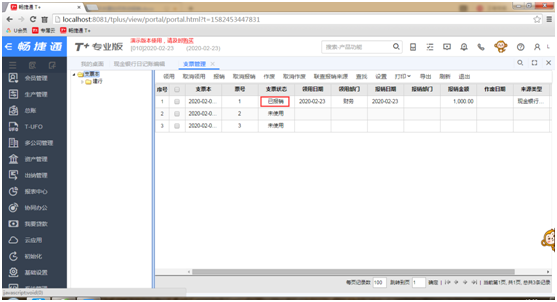6.返回到【支票管理】中查看支票是【已核销】状态。
