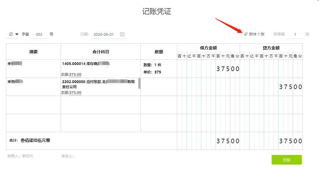 在生成的凭证右上角会有【附件】按钮,点击就可以随时查看和下载这张电子发票了。